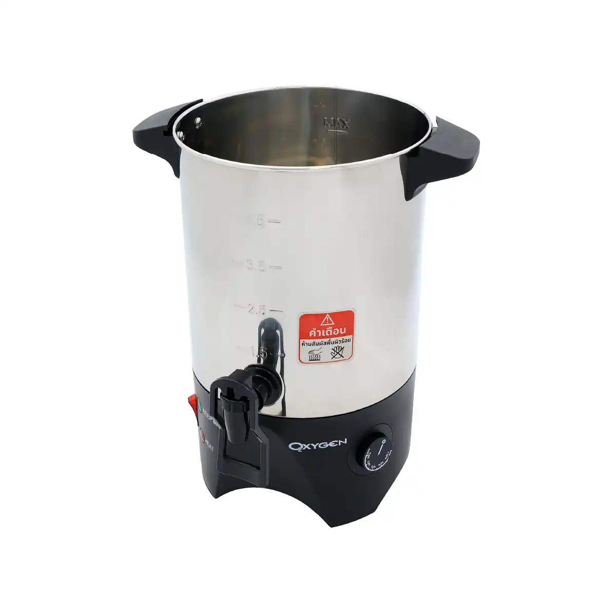 • มีหูจับ,ฝา และฐานถังต้มน้ำผลิตจากพลาสติก แข็งแรง ทนทานต่อความร้อน